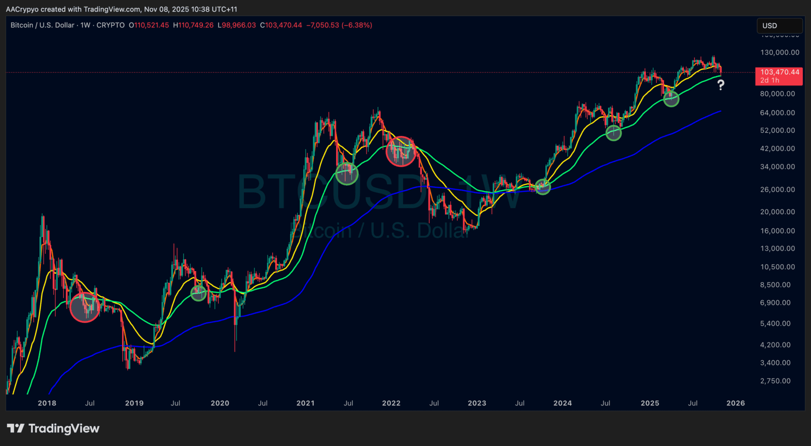 The $100K level has strong technical support. Zooming out, we are now testing the weekly 55 EMA, which has historically been a key trend-defining level for Bitcoin.