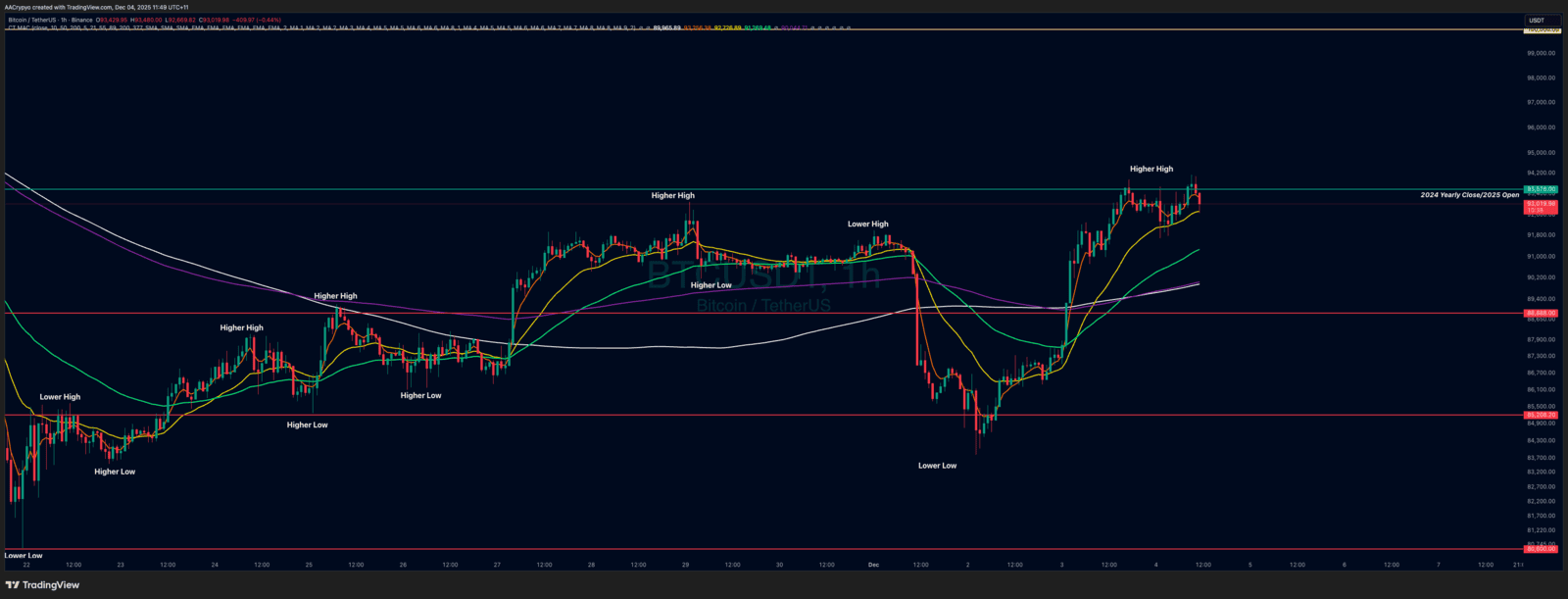2025 has been a year of ups and downs but with 11 months in the book, price action remains largely flat. $93.5K is the decisive level that will determine whether this year ends green or not. Bitcoin continues its bullish recovery, up nearly 2.5% in the last 24 hours and now more than 10% higher from the recent higher low set three days ago.