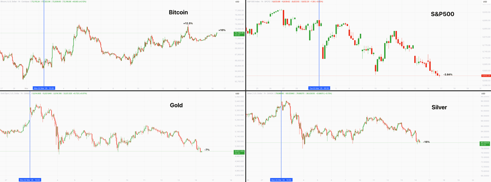 The S&P 500 has erased roughly $2.4 trillion in market value since the conflict began, falling around 3.8% as investors reduce exposure to equities. More surprisingly, precious metals have not offered the kind of shelter investors would normally expect. Gold has slipped roughly 7% while silver has dropped nearly 16%, wiping around $2.5 trillion from their combined market capitalisation as traders rotate away from traditional defensive assets.