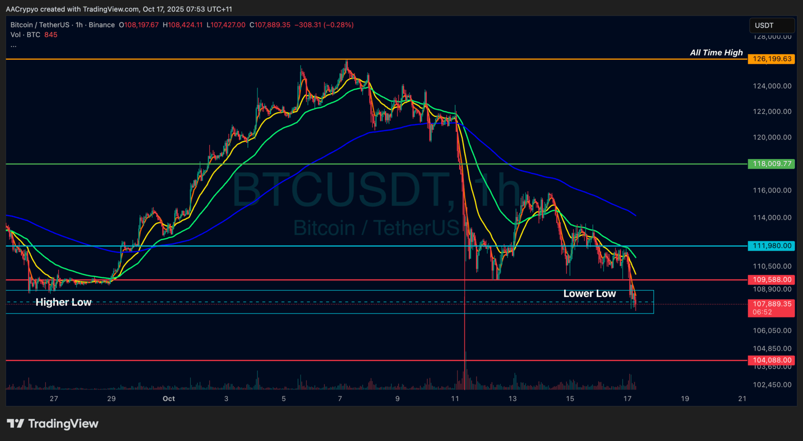 The ripple effect hit traditional indices like the S&P 500 and Nasdaq, as well as the US dollar, with the DXY falling for a third consecutive day. Given Bitcoin’s current correlation to risk-on equities, it also fell over the past 24 hours and now trades below $108,000.