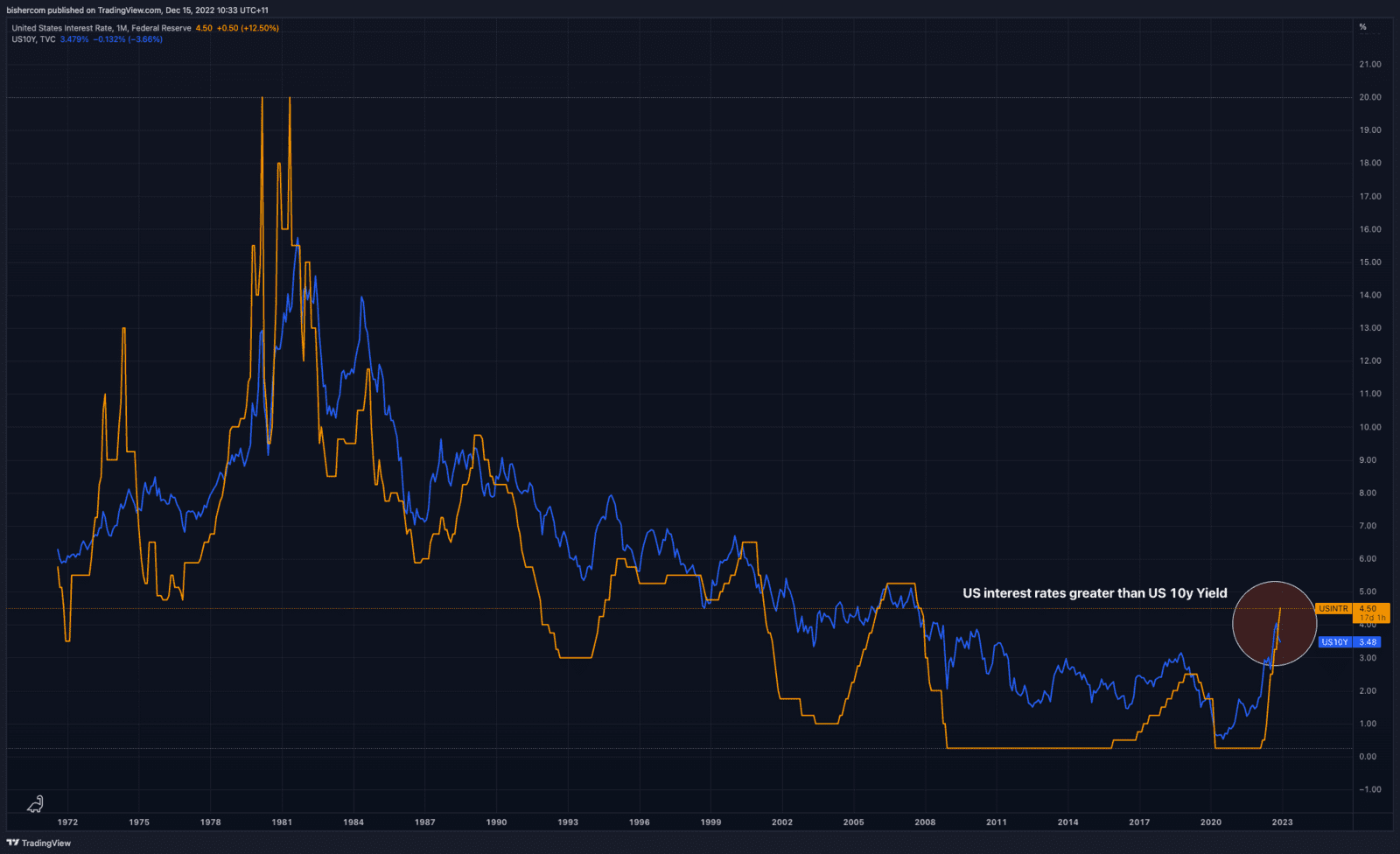 The FOMC meeting happened earlier this morning and brought with it a rate hike of 50bps. This has officially lifted the US interest rate over the US 10y bond yield, a signal that precedes a pivot in FED policy but also precedes global recessions.