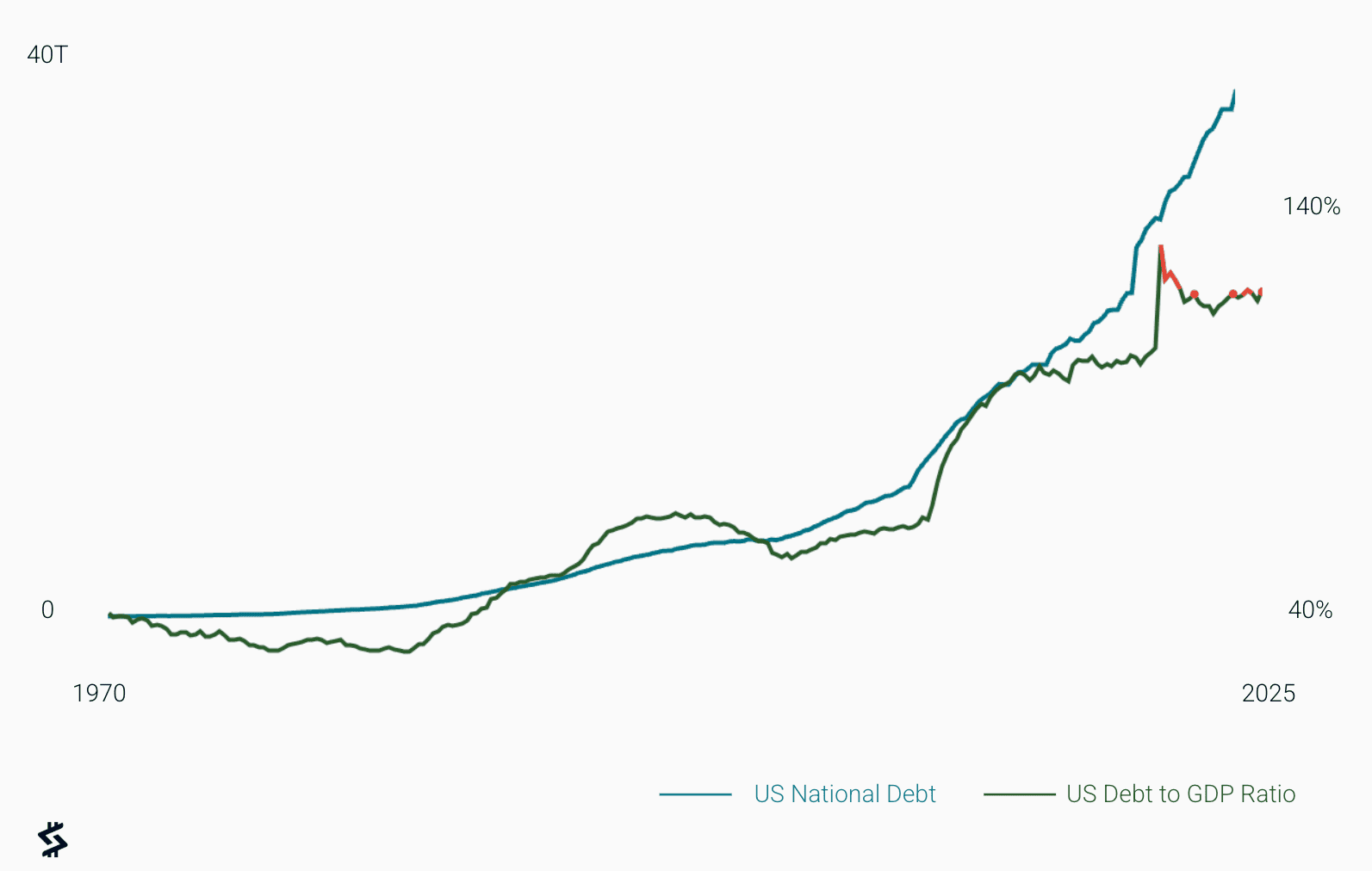 US national debt now stands at approximately $38.5 trillion and is projected to reach around $59 trillion within the next decade. Debt to GDP has surpassed 120%, a level that historically signals the beginning of reserve currency stress.