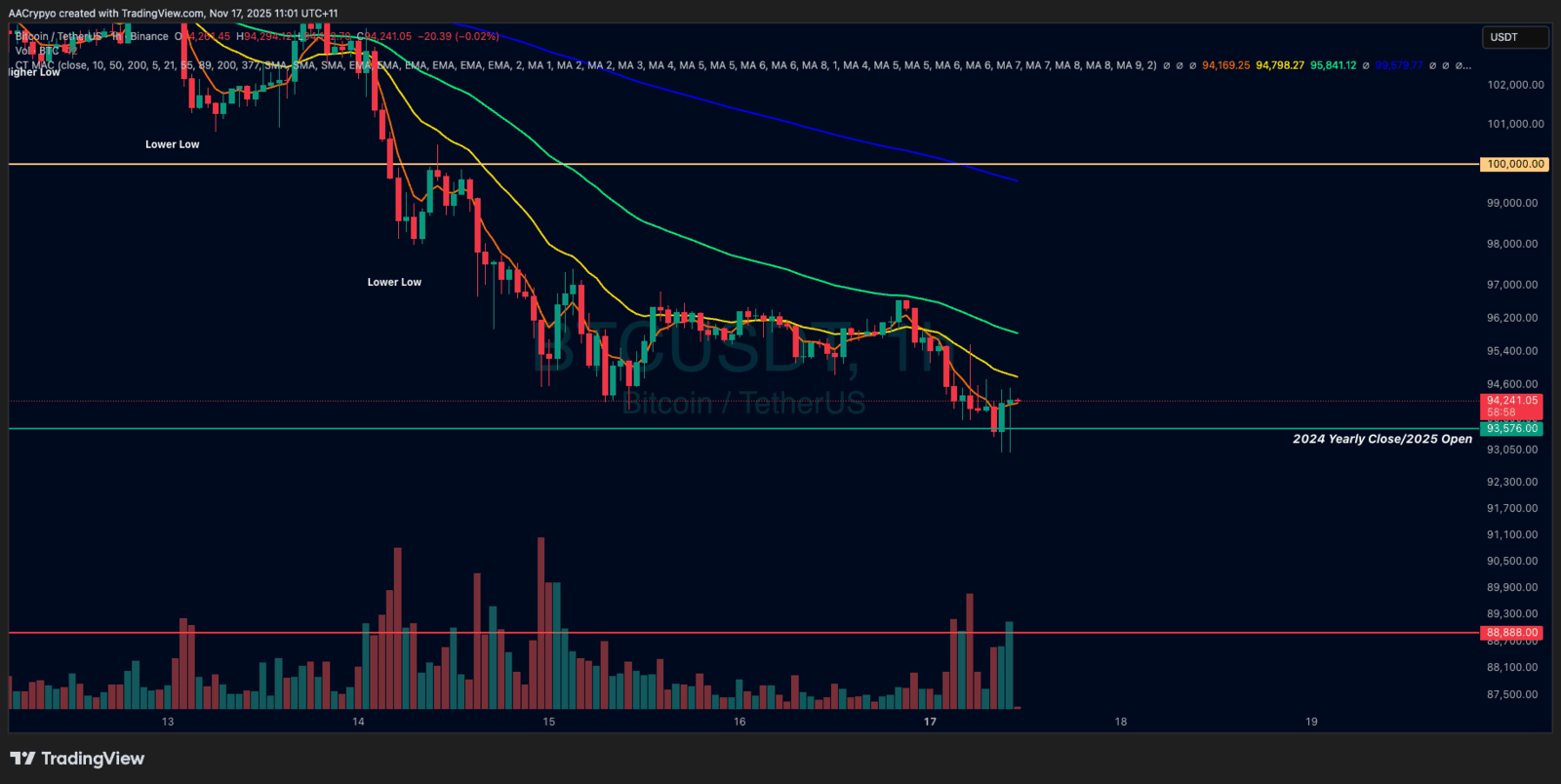 We have mentioned it a few times before. The weekly Bitcoin exponential moving averages, particularly the 55EMA, continue to play a major role in shaping market structure. Last week, we pointed out a bounce from this level and highlighted its importance. In Saturday’s morning note, we said Bitcoin had fallen below it and needed to reclaim $99,000. It was a major test that the bulls ultimately failed.
