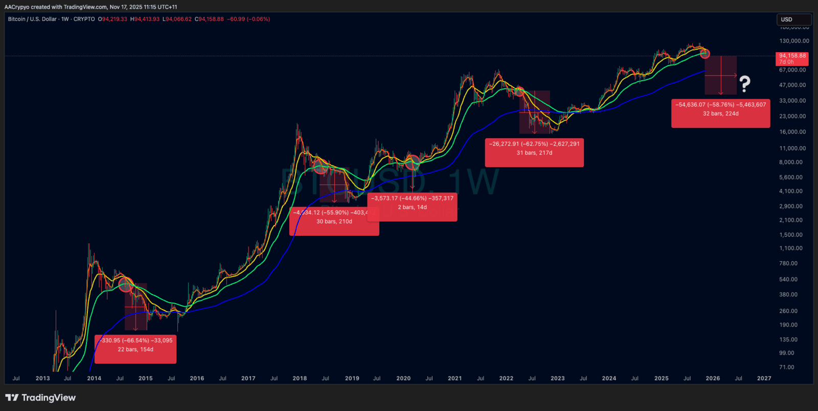 Bitcoin has now closed below the 55EMA on the weekly chart for the first time since September 2023, when the market was beginning to recover from the previous bear cycle. The last time this happened while still in a bullish posture, meaning the 21EMA remained above the 55EMA, was in April 2022. That breakdown preceded a larger decline that eventually took Bitcoin to $15,000 later that year.