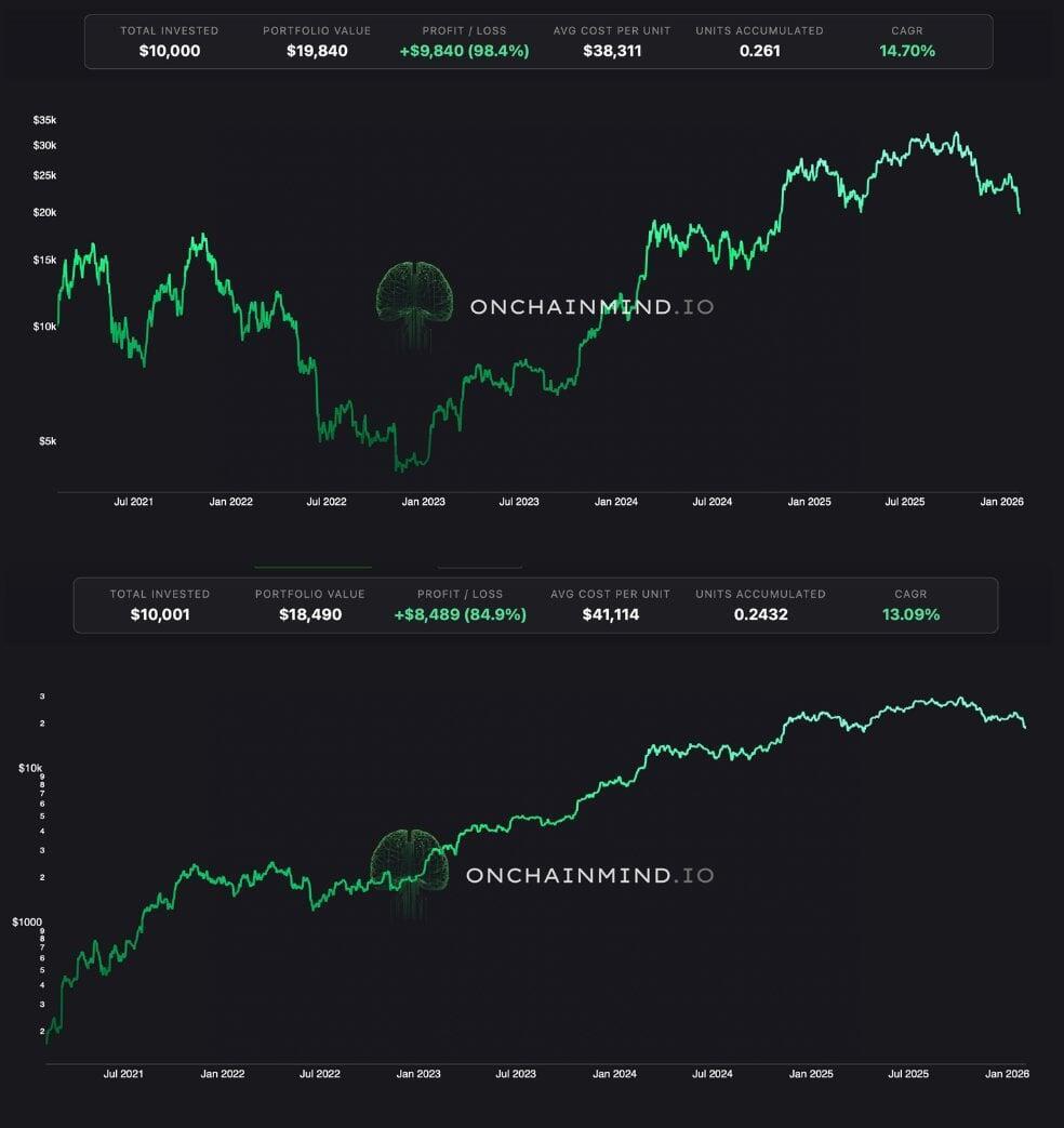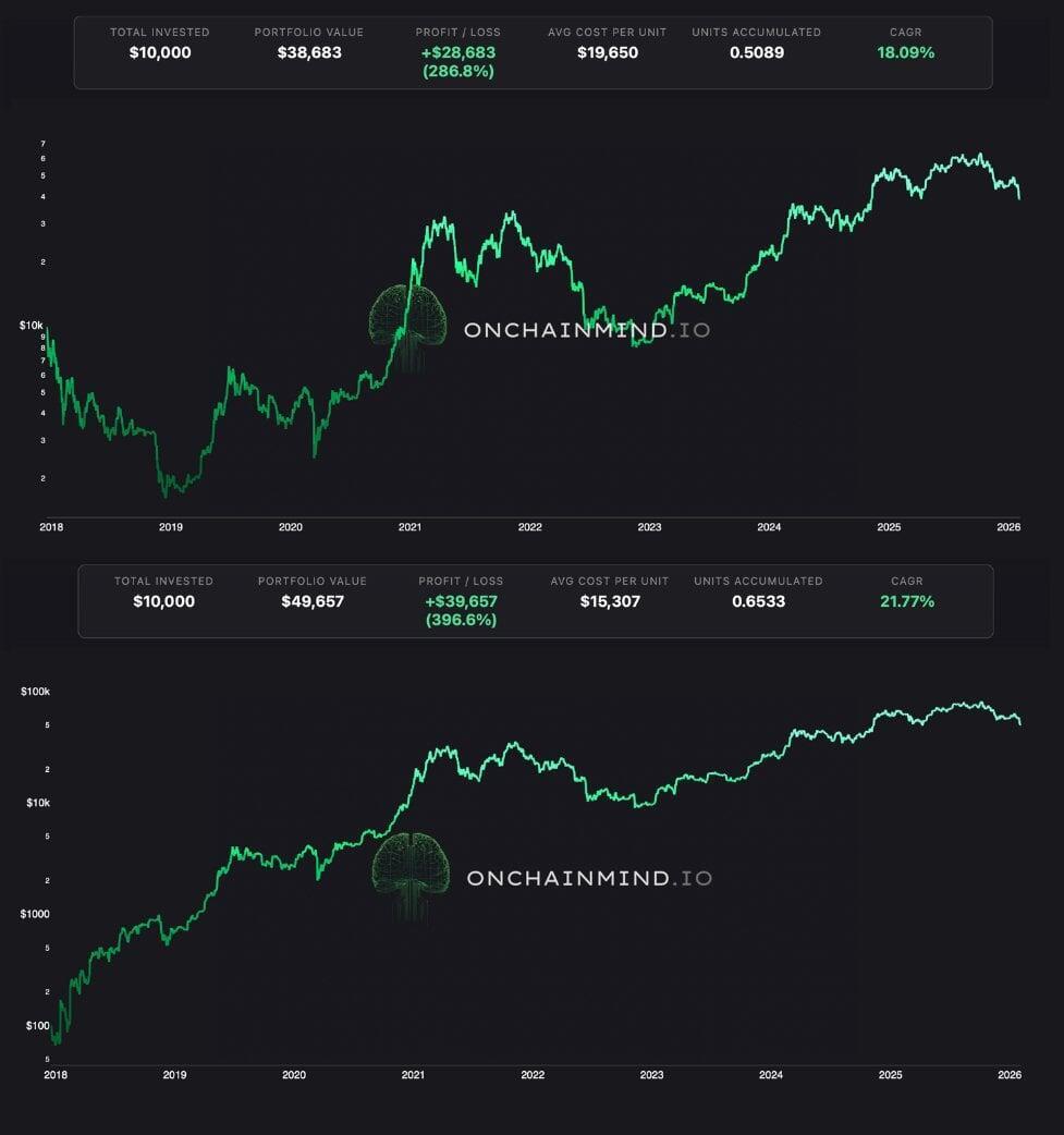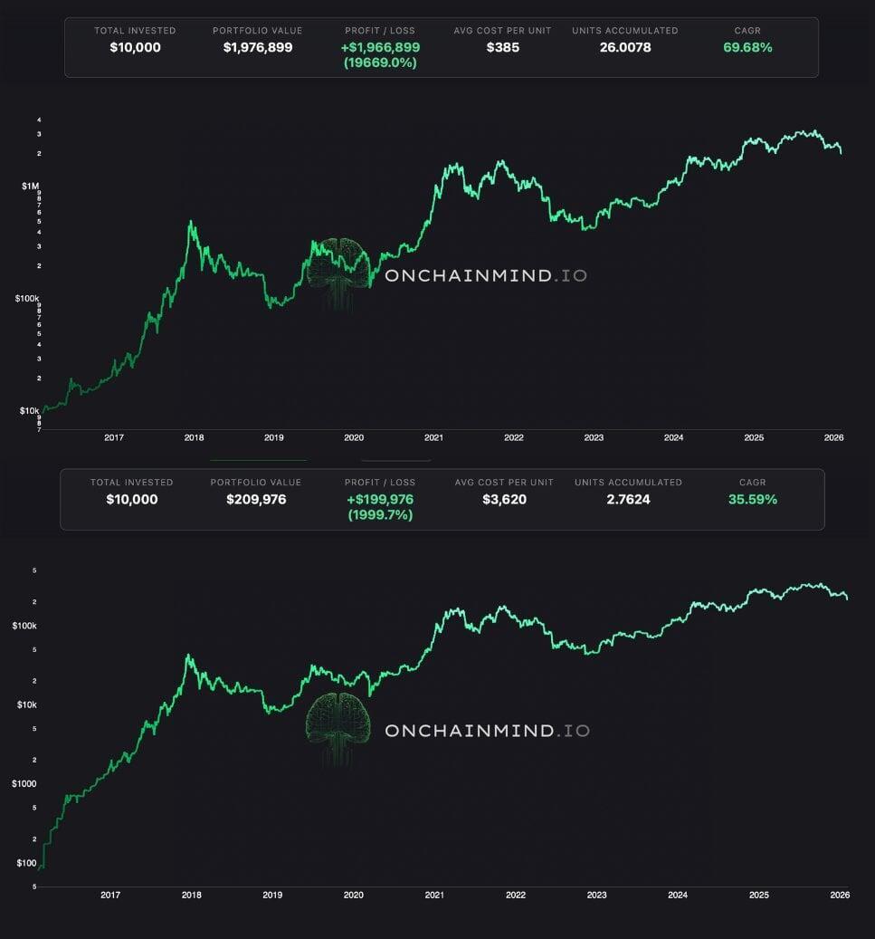 Looking back a decade highlights the power of time in the market for lump sum investors. A $10,000 investment in 2016 would have acquired just over 26 BTC. At current prices, that portfolio would be worth nearly $2 million, delivering a CAGR of over 69%.