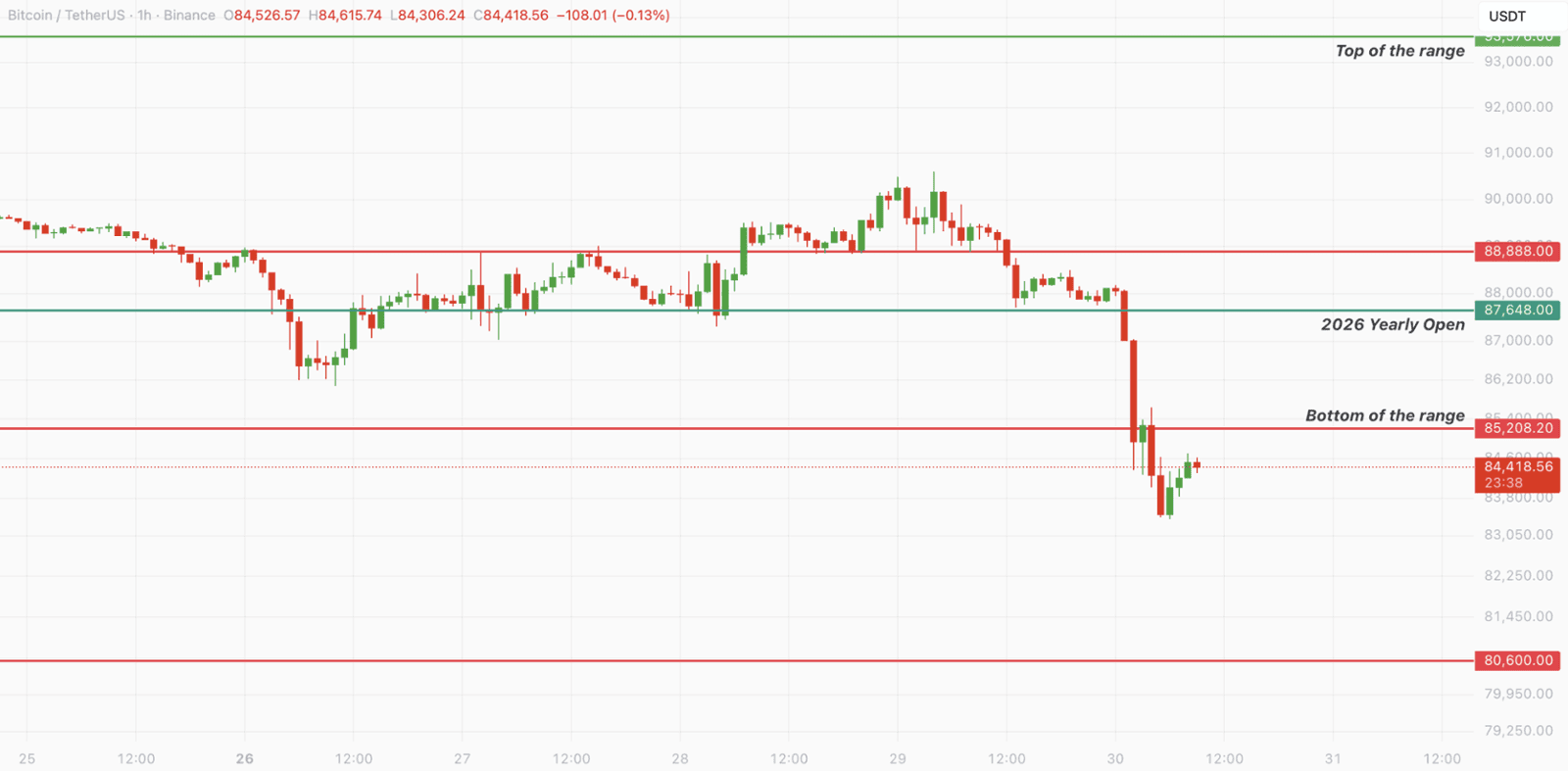 In a single hour, gold lost nearly 6% and at one point was down close to 8%, wiping out over $3 trillion in market cap. Silver closed that same hour down more than 8%, and at its worst was nearing a double-digit percentage loss, wiping out $760 billion in market cap. Traditional risk-on assets followed, the S&P 500 lost over 1.5% and the Nasdaq fell nearly 2.5%. Bitcoin was not immune either, falling nearly 2.5% in just one hour.
