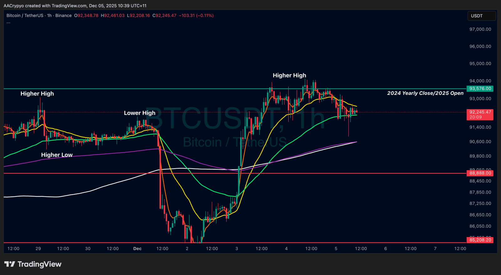 Bitcoin has been climbing since forming a higher low earlier this week, with signs that smart money may be returning and whale activity picking up once again. It is currently hovering around $92.5K and continues to battle the yearly open at $93.5K.