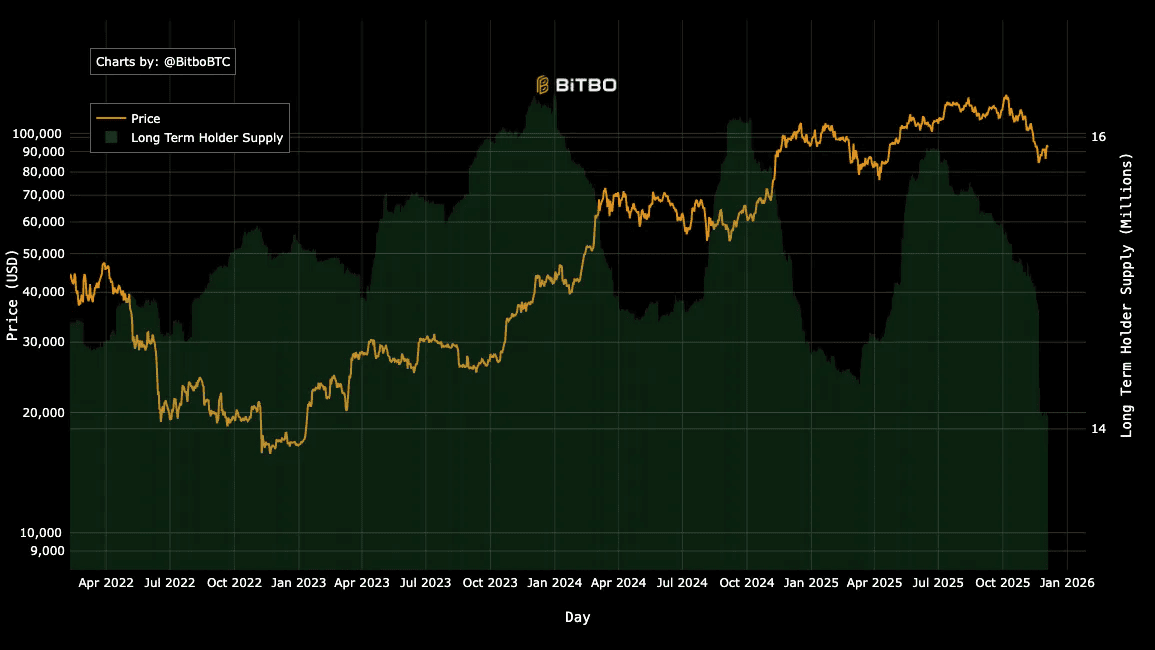 The next key stage was in late 2024 and early 2025. Once again, long term holder supply peaked before tapering off. Bitcoin printed another all time high soon after. Then supply started climbing again, supporting another push higher. Since July, however, long term holder supply has been falling steadily. Bitcoin set a new all time high shortly after but is now in another corrective phase.