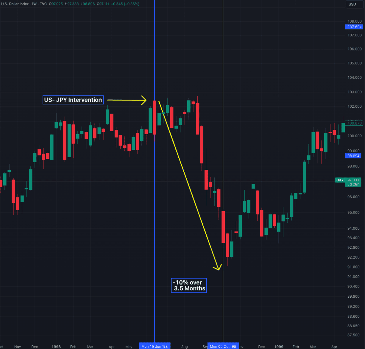 The last time we saw a significant US intervention of this scale into the Yen was during June of 1998. This was a time of extreme economic fragility on Japan’s behalf and was the consequence of a meteoric asset valuation bubble, fueled by global trade and manufacturing relations that couldn’t sustain itself. This led to a multi-decade bear market for the entire Japanese economy, commonly referred to as “the lost generation”. Upon the intervention, the USD nose-dived a whopping 10% in just three and a half months post-purchasing the Yen en-mass.